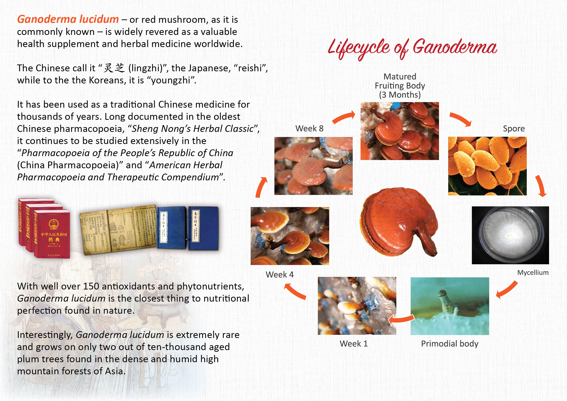 Ganoderma lucidum, a medicinal mushroom whose name in Latin means “Red shiny skin,” has been used in Traditional Chinese Medicine for thousands of years. It is also known as “Lingzhi” in China, “Reishi” in Japan, and “Youngzhi” in Korea. The mushroom's history is documented in the ancient Chinese pharmacopeia, "Sheng Nong’s Herbal Classic," where it was revered as a symbol of prosperity, peace for the nation, and longevity for the emperor.