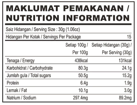 месь злаков (50%) пшеница, сахароза, кукуруза, соя, экстракт солода (ячмень), спирулина, соль, рис и экстракт ганодермы блестящей (0,5%), тростниковый сахар и немолочные сливки [твердые вещества глюкозного сиропа, гидрогенизированный растительный жир (пальмоядровый), молочный белок, противослеживающий агент (INS 551), стабилизаторы (INS 340(i), INS 451(i)), эмульгаторы (INS 471, INS 472e).