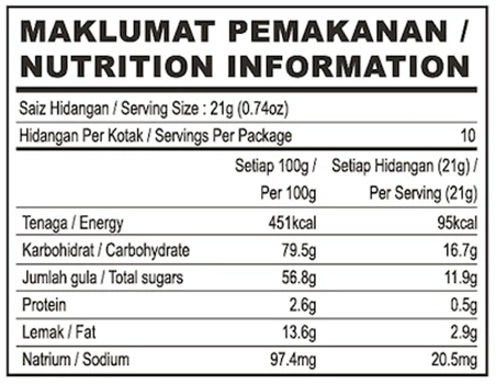 Сахар, немолочные сливки твердые вещества глюкозного сиропа, гидрогенизированный растительный жир (пальмоядровый), молочный белок, противослеживающий агент (INS 551), стабилизаторы (INS 340(i), INS 451(i)), эмульгаторы (INS 471, INS 472e), растворимый кофе (10,5%), экстракт ганодермы блестящей (0,7%), ароматизатор, экстракт женьшеня (0,5%) и порошок тонгкат али (0,1%).